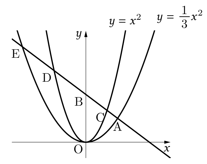 図のように、$\displaystyle y=\frac{1}{3}x^2$ 上に点A$(3, 3)$ がある。点Bは $y$ 軸上の点とし、直線ABと $y=x^2$ の交点をC、Dとする。また、点Eは直線ABと $\displaystyle y=\frac{1}{3}x^2$ の交点でA以外の点とする。点Bを $\mathrm{AB=BD}$となるようにとる。