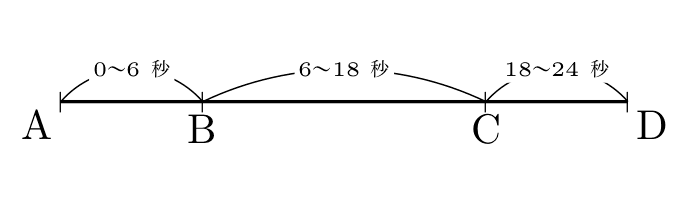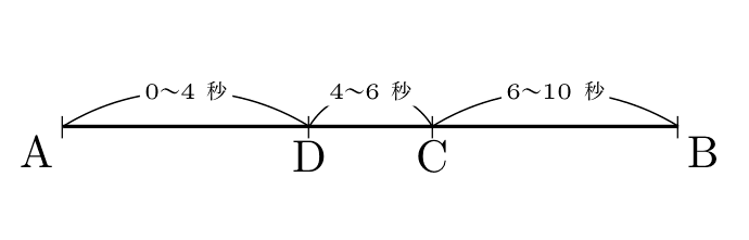 この「重なる」という部分をどう考えるかがポイントになりますが、図を見ながら実際にP、Qの動きをたどってみると分かりやすいと思います。A→B→C→Dと進むP、A→D→C→Bと進むQがBC上で出会ったときは、以下のようになります。