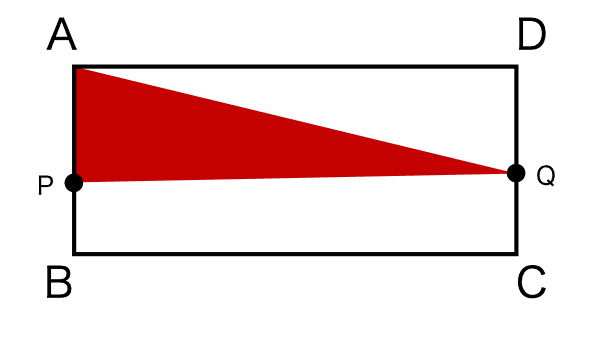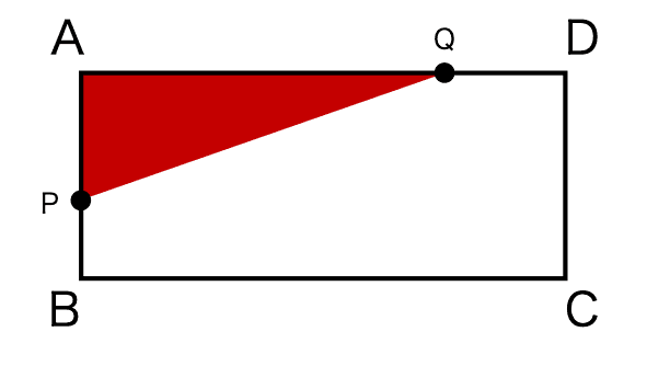 図の赤い部分の三角形の面積が $y$ です。これは簡単ですね。APを底辺とみれば、この区間では高さは常に一定でADの長さと一致します。また、APの長さはPが進んだ距離なので $x$ です。したがって、