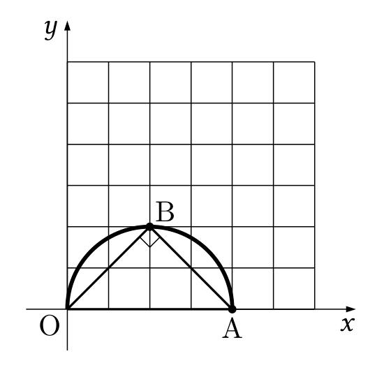 図の円弧上にBがあるときは、円周角の定理からすべて $\angle \mathrm{OBA}=90^\circ$ となります。しかし、この円弧は、$(2,\ 2)$ 以外のBが取り得る格子点を通ることはないので、$(1,\ 2)$ や $(3,\ 2)$ はNGとなりますね。