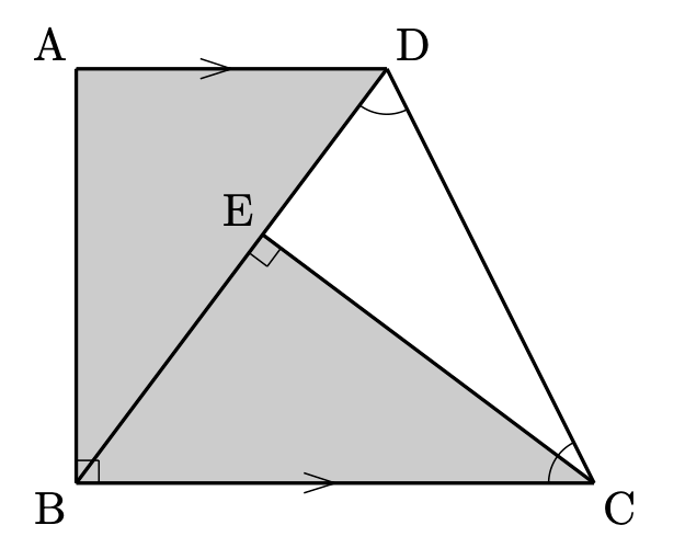 ここは、$\mathrm{AD}// \mathrm{BC}$ から $\angle\mathrm{ADB}=\angle\mathrm{EBC}$ の錯角が等しくなることがすぐに見抜けるようになってほしいですね。