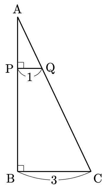 これが取り出せたら簡単ですね。$\triangle\mathrm{ABC}\sim\triangle\mathrm{APQ}$ となるので、相似比から $\mathrm{AP}$ が求められます。そのとき、 $\mathrm{AB}$ の長さは $\triangle\mathrm{APQ}$ において三平方の定理から