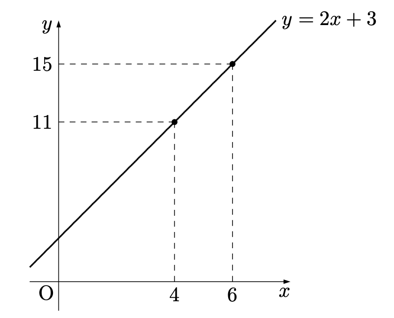 (3)は1次関数の問題でした。$y=2x+3$ において、$x$ が $4$ から $6$ まで増加した時の $y$ の増加量を求める問題です。まずは、グラフをイメージしてみましょう。
