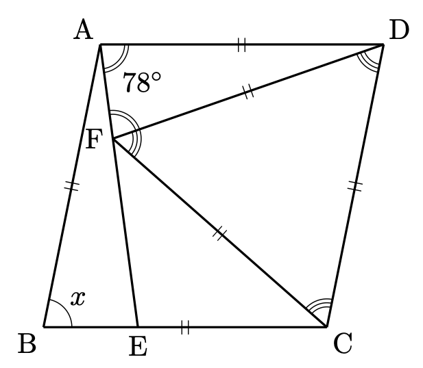 を押さえておきます。さらに、$\mathrm{CD=DF=FC}$、$\angle\mathrm{DAE}=78^\circ$ となるので、結局下図のようになることがわかります。