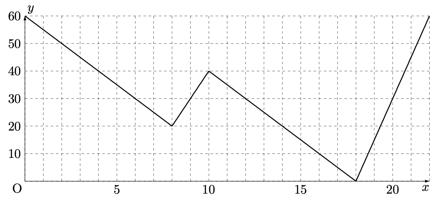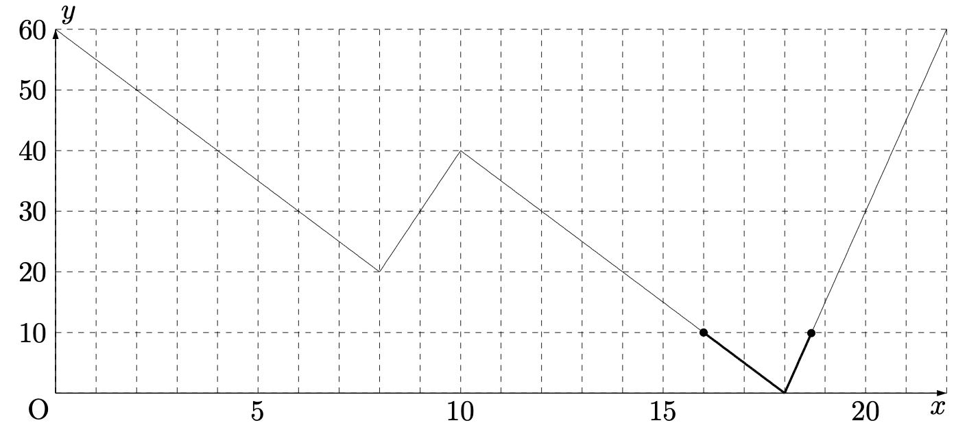 グラフの太い部分が該当します。まず、16〜18の2分間と、18〜ちょっとよく分からないところまでの間です。「18〜ちょっとよく分からないところ」と書きましたが、これはグラフから $\displaystyle\frac{2}{3}$ 分間であることが読み取れないとダメです。