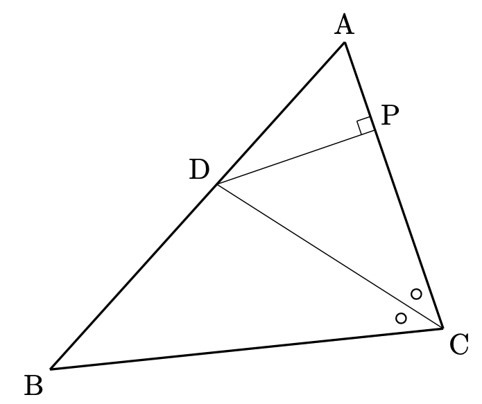 条件②の $\angle\mathrm{ACB}$ の二等分線と辺 $\mathrm{AB}$ との交点を $\mathrm{D}$ とすると、$\mathrm{AC\perp PD}$ となる、というのを大まかにイメージしてみましょう。