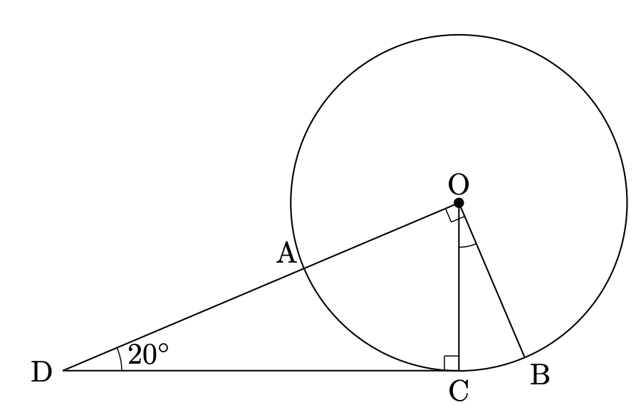 と表せます。先ほどの式と比べると、$\angle\mathrm{COB}=\angle\mathrm{ODC}=20^\circ$ となることが分かります。