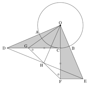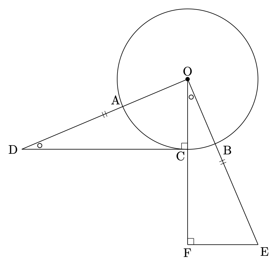 (2)は合同の証明です。まずは、条件を確認しておきましょう。$\mathrm{OE=OD}$、$\angle\mathrm{OFE}=90^\circ$ となります。