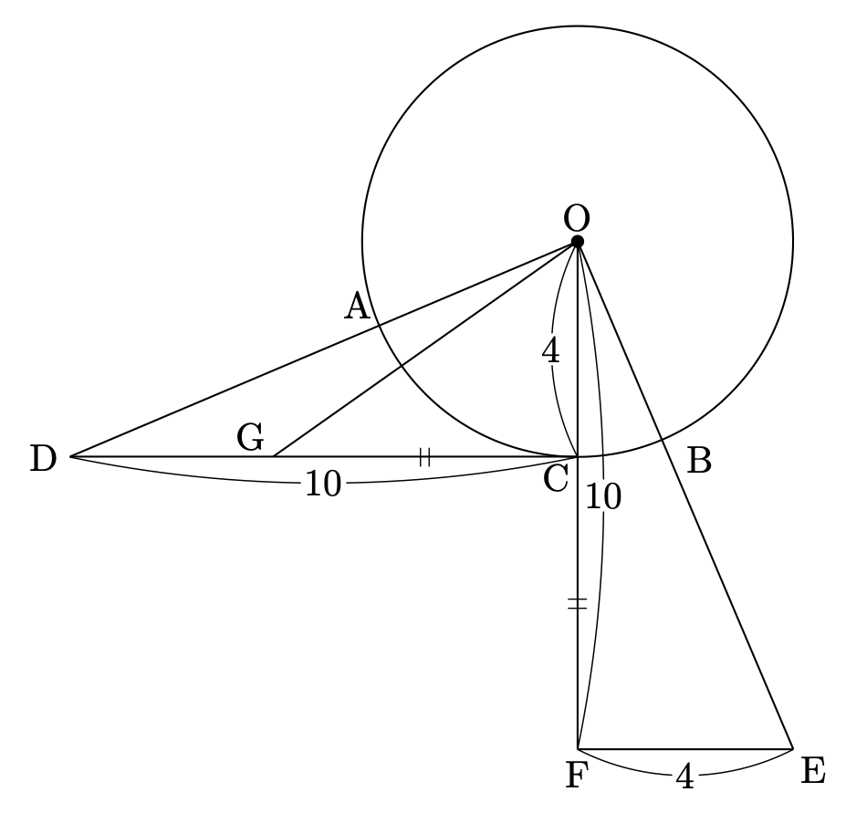 実は、長さが与えられているのは $\mathrm{CD=10cm}$ と 円の半径 $\mathrm{4cm}$ だけとなります。これを(2)の結果と合わせて、長さがわかる部分を増やしていきます。