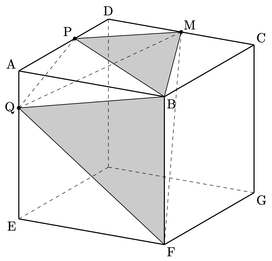 求める立体はよく分からない図形のように見えますが、面 $\mathrm{MBQ}$ で2つの立体に分割すると、それぞれが三角錐になります。