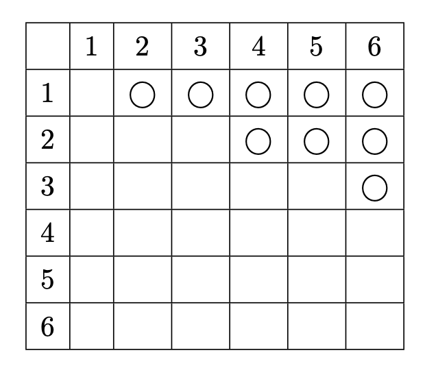 (5)は確率の問題でした。大きいサイコロの出た目を $a$、小さいサイコロの出た目を $b$ として、$a$ が $b$ の2倍以上となる確率を求める問題です。下図のように、縦に $b$、横に $a$ をとると、すぐにわかるでしょう。