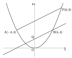 A、B、Pはすべて $\displaystyle y=\frac{1}{4}x^2$ 上の点なので、座標を求めると $(-4,\ 4)$、$(4,\ 4)$、$(6,\ 9)$ となります。