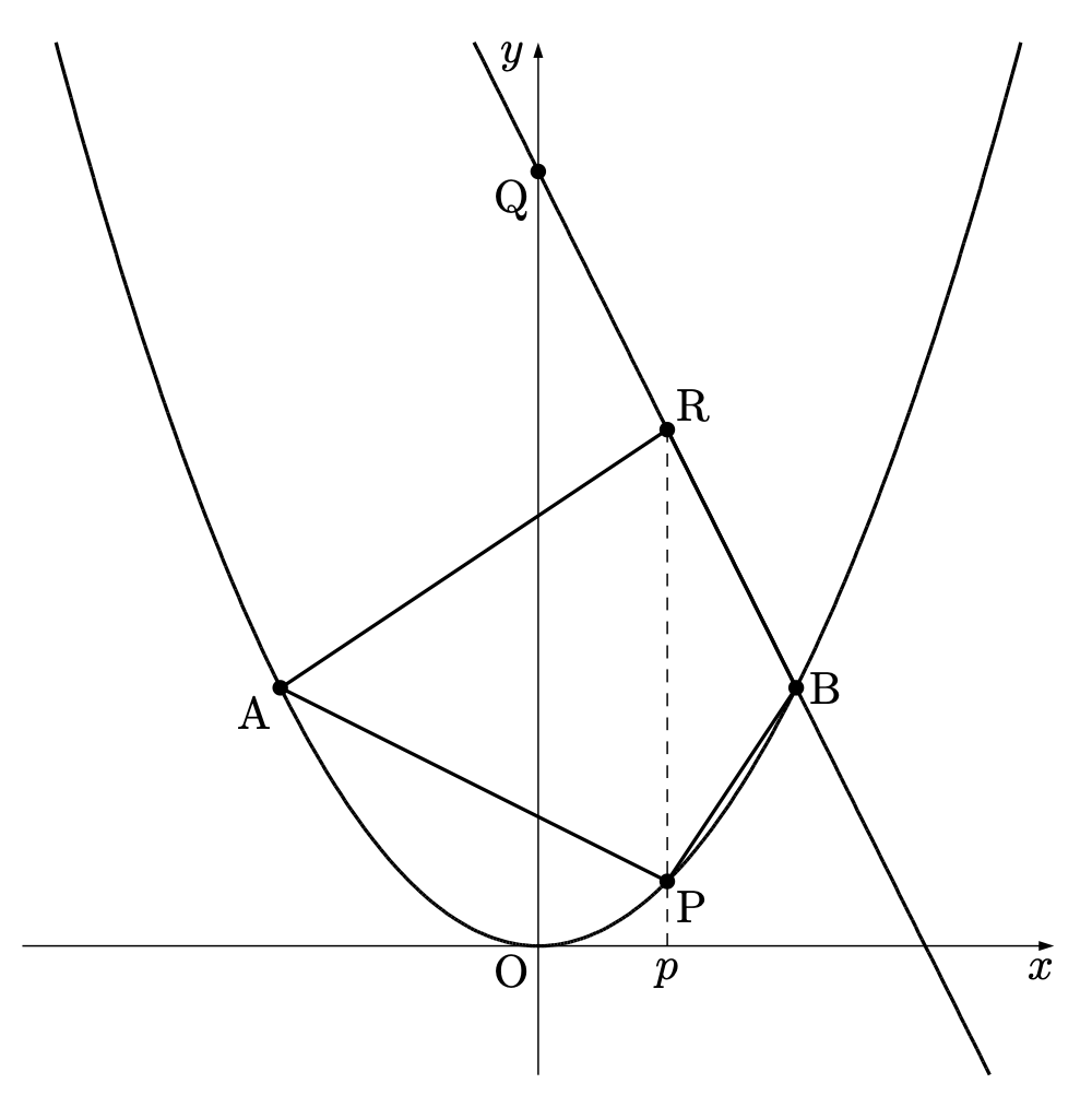一方、P$\displaystyle\left(p,\ \frac{1}{4}p^2\right)$ となるので、RPの長さは $\displaystyle -2p+12-\frac{1}{4}p^2$ となります。