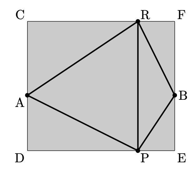 ここで上のような図を考えます。$\triangle\mathrm{ARP}$ と $\triangle\mathrm{BRP}$ の面積は、それぞれ長方形 $\mathrm{CDPR}$ と $\mathrm{FEPR}$ の面積の半分となることに注意しましょう。このことから、四角形 $\mathrm{APBR}$ の面積は、四角形 $\mathrm{CDEF}$ の半分であることが分かります。