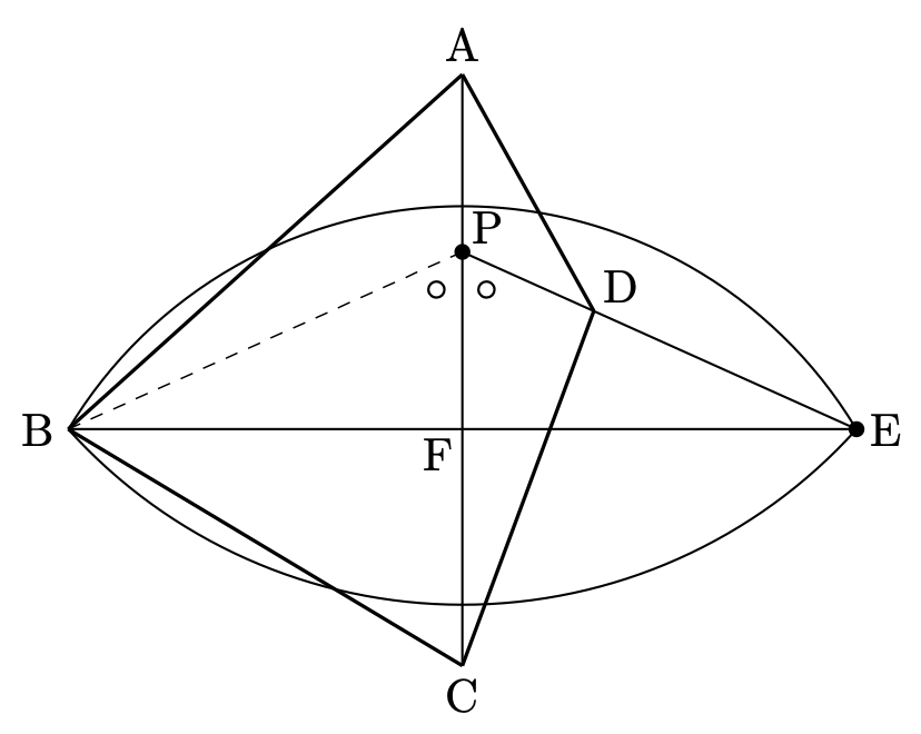 条件を満たすようなPは、だいたい上の図のような位置にきそうです。問題は、このPが一体どんな点なのかということです。$\angle\mathrm{BPC}=\angle\mathrm{DPC}$ をよ〜く意識して図形を見てください。このときに、下図のような二等辺三角形PBEが見えてきた人は、かなり図形に強いのではないかと思います。