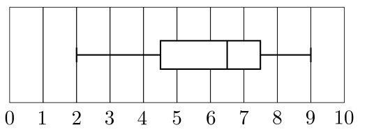 箱ひげ図からは、最小値が2、最大値が9、第1四分位数が4.5、第2四分位数が6.5、第3四分位数が7.5とわかります。