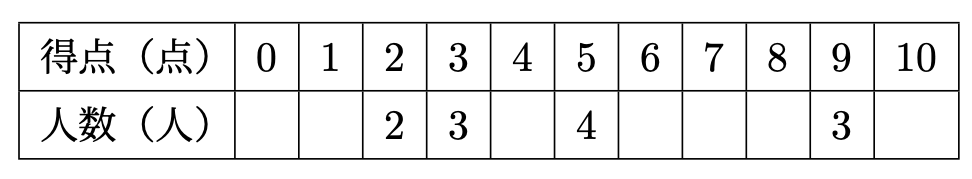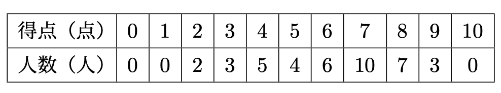 箱ひげ図から、最小値は2となっているので、0点、1点の人数は0となります。また、4点以下の生徒が10人となるので、4点の人数は5となります。次に、5点以上6点以下の生徒が10人となるので、6点の人数は6人となります。さらに、7点の生徒は10人です。また8点以上10点以下の生徒が10人で、最大値が9より10点は0人、したがって、8点は7人となります。