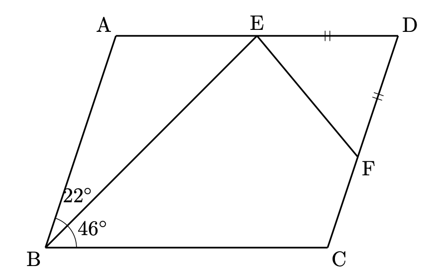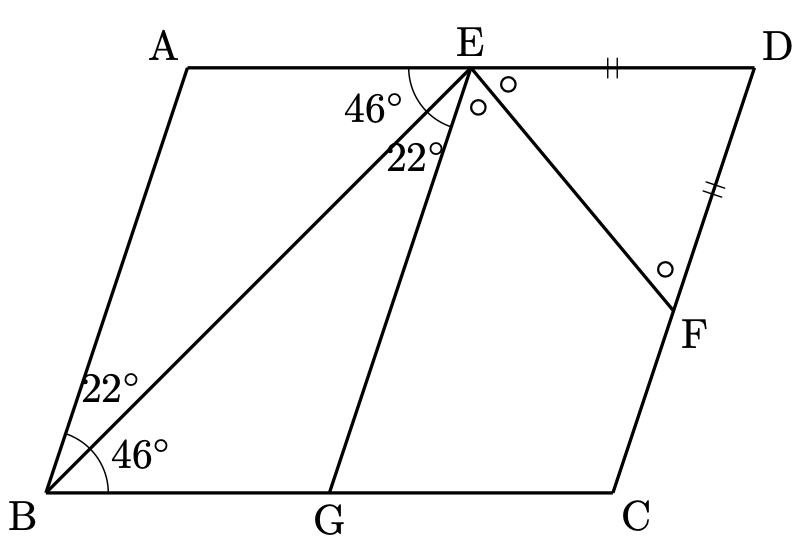錯角によって、$46^\circ$ と $22^\circ$ が図のように現れます。また、$\mathrm{DE=DF}$ なので、$\angle\mathrm{DEF}=\angle\mathrm{DFE}$ であり、さらに錯角によって、$\angle\mathrm{GEF}$ も等しい角となります。