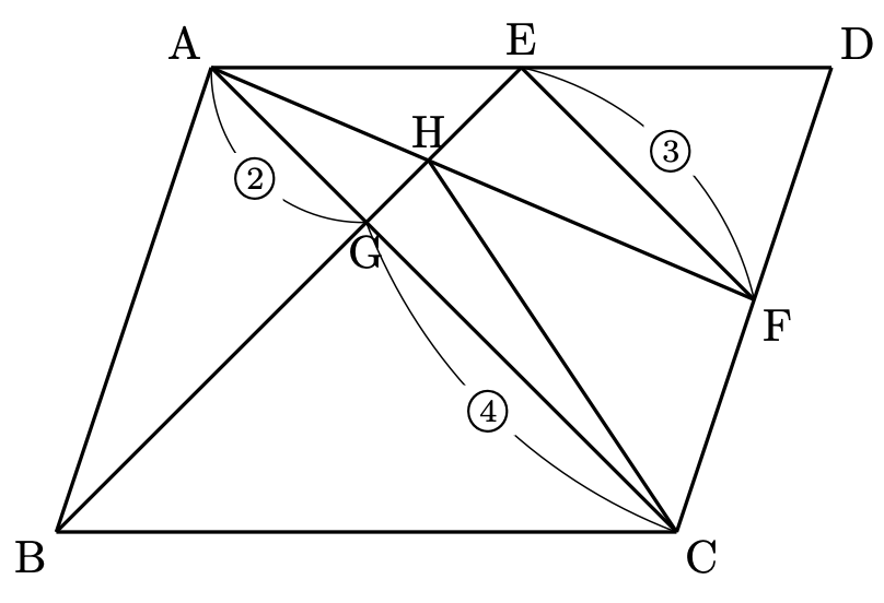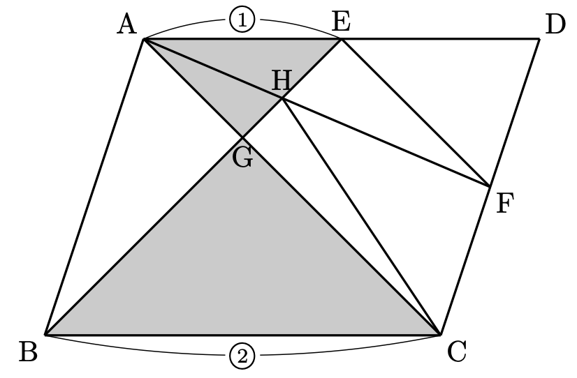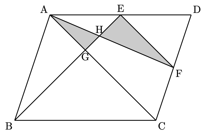 図の $\triangle\mathrm{CFH}$ と平行四辺形ABCDの面積比を求める問題です。いきなり $\triangle\mathrm{CFH}$ と平行四辺形ABCDを比べることはできないため、まずは、平行四辺形と比較しやすい三角形を考えるところからスタートしましょう。
