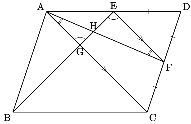 中点連結定理によって、$\mathrm{EF//AC(AG)}$ となるため、図のように $\angle\mathrm{GAH}=\angle\mathrm{EFH}$、$\angle\mathrm{AGH}=\angle\mathrm{FEH}$ となるので $\triangle\mathrm{AGH}\sim\triangle\mathrm{FEH}$ となります。