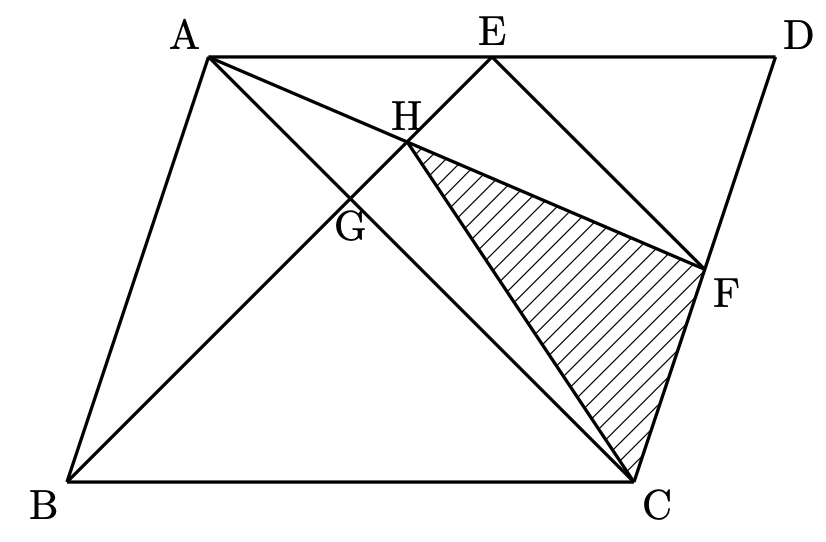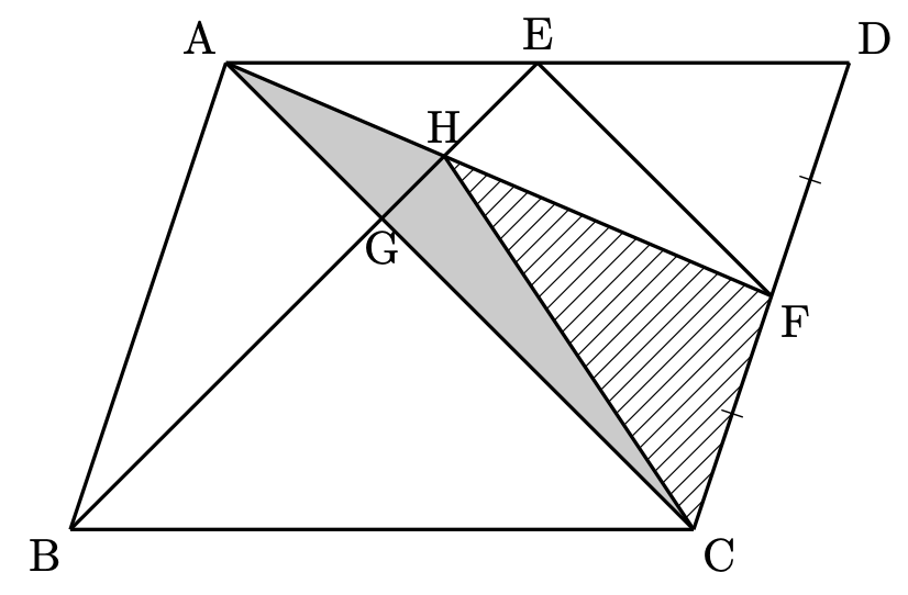 上図のように $\triangle\mathrm{CFH}$ に $\triangle\mathrm{CHA}$ を加えた $\triangle\mathrm{ACF}$ を考えるといいでしょう。この $\triangle\mathrm{ACF}$ は 平行四辺形の半分の面積となる $\triangle\mathrm{ACD}$ をさらに半分にした面積になります($\mathrm{DF=FC}$に注意)。
