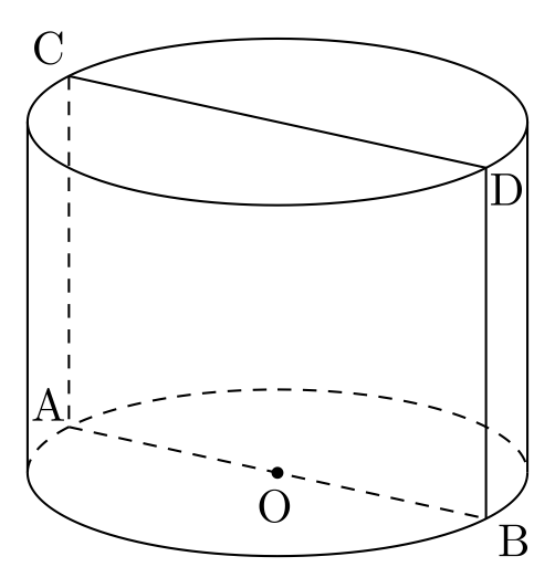 (2)は下図において、$\mathrm{AB=10cm}$、$\mathrm{AC=BD=9cm}$ であるときの円柱の表面積を求める問題です。
