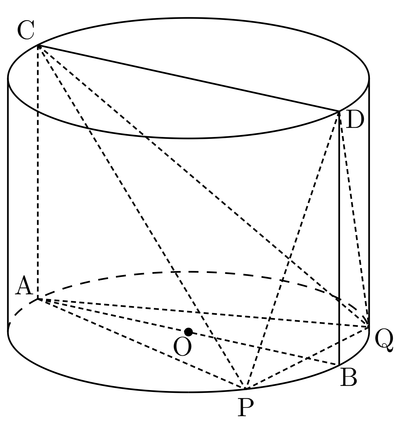 円Oの周上に、$\angle\mathrm{BAP}=15^\circ$ となる点Pをとり、Pを含まない弧AB上に、$\angle\mathrm{BAQ}=15^\circ$ となる点Qをとり、四面体CDPQを作ります。このとき、四面体CDPQの体積を求めよ、というのが問題です。