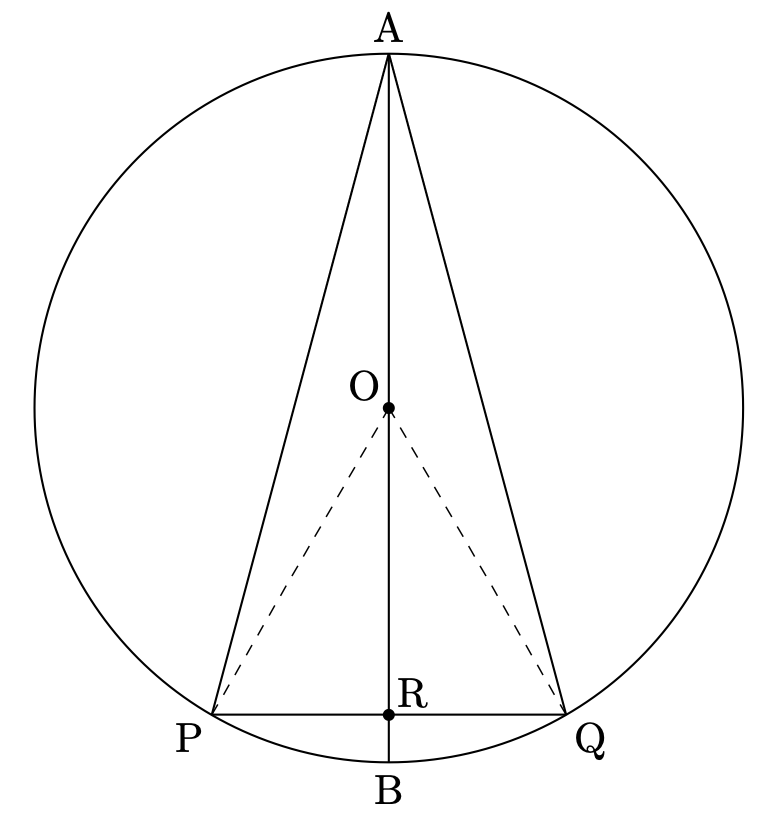 まずは真上から見た図を考えましょう。$\angle\mathrm{BAP}=15^\circ$、$\angle\mathrm{BAQ}=15^\circ$ なので、PとQはABに関して対称となります。また、円周角の定理から、$\angle\mathrm{BOP}=30^\circ$、$\angle\mathrm{BOQ}=30^\circ$ となります。したがって、$\angle\mathrm{POQ}=60^\circ$ であり、$\triangle\mathrm{OPQ}$ は正三角形であることが分かります。