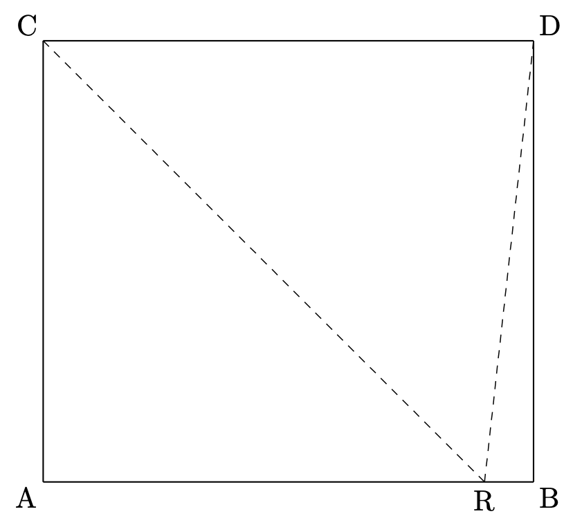 このとき、先ほど真上から見た図をかいたときに現れたRは上のような位置にきます。このとき、$\triangle\mathrm{CDR}$ は、四面体CDPQを面ABDCで切断したときの断面となります。そしてこの面積は