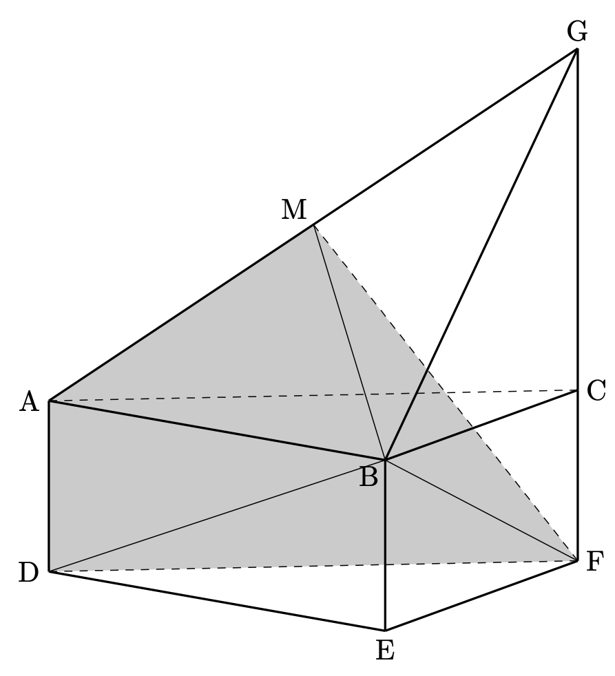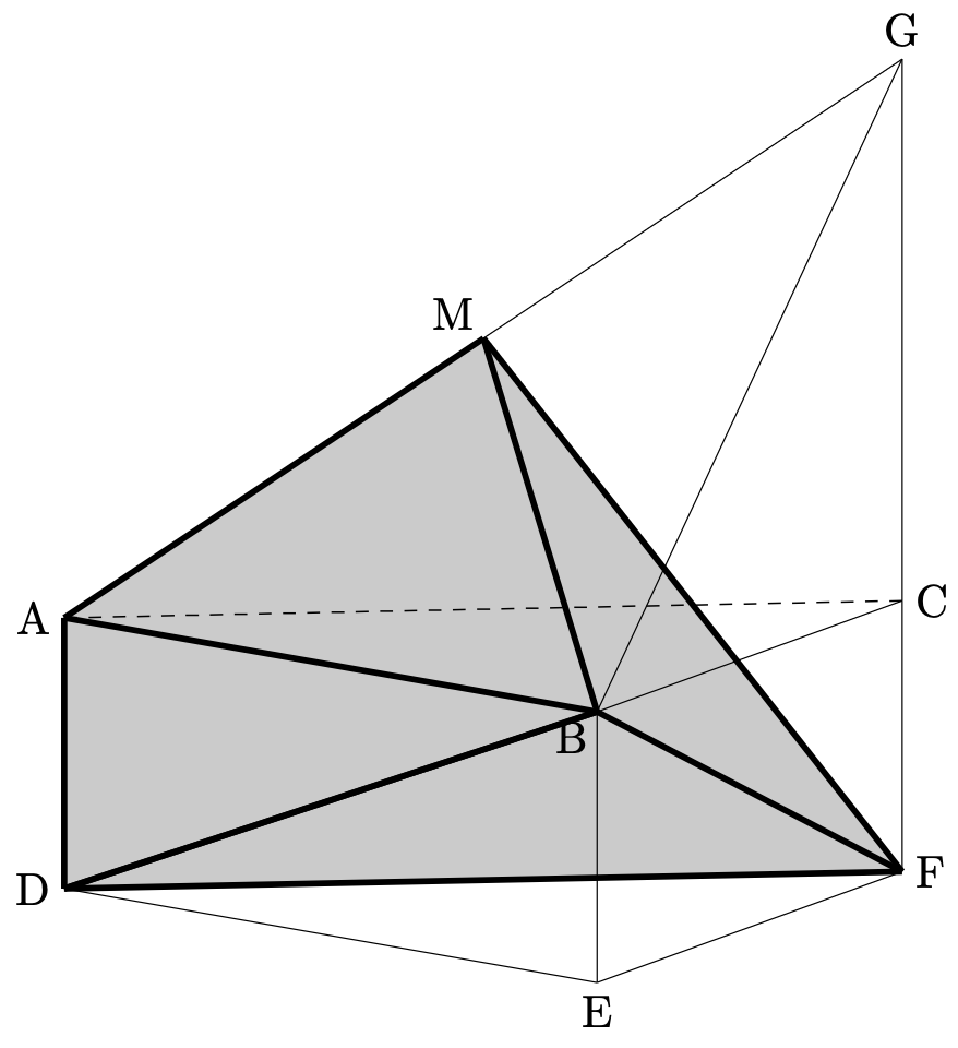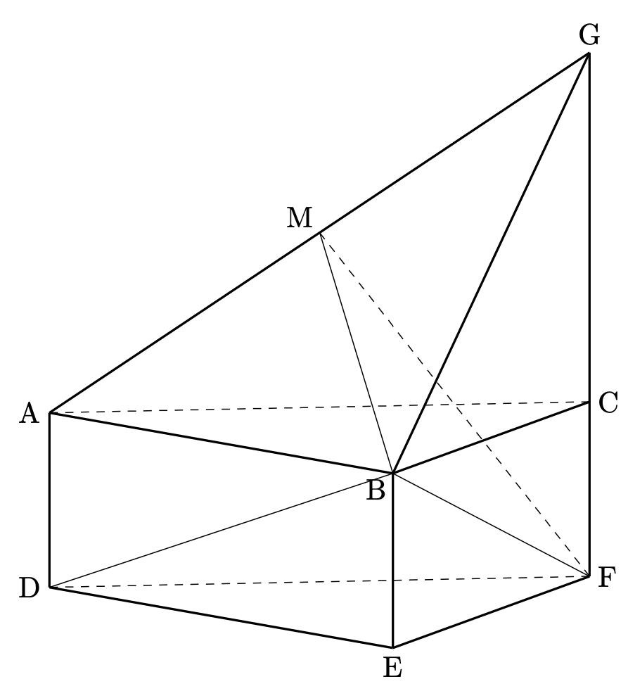 (2)の図において $\mathrm{AG}$ の中点 $\mathrm{M}$ が新たに与えられます。このとき四角錐 $\mathrm{B-ADFM}$ をつくり、その体積を求めよという問題です。