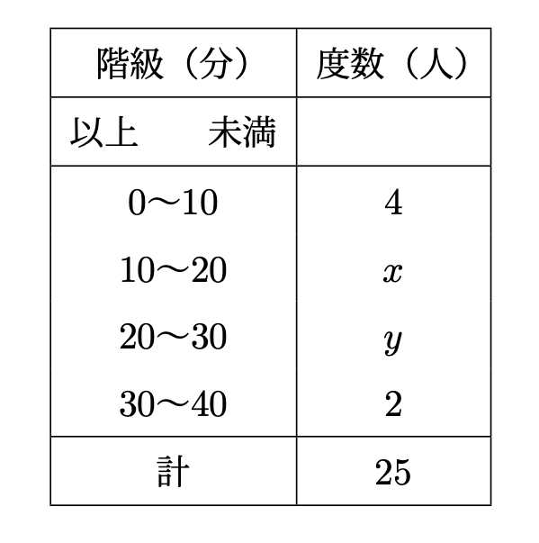 あるクラス25人の生徒の通学時間を調べたものが下の度数分布表で与えられます。