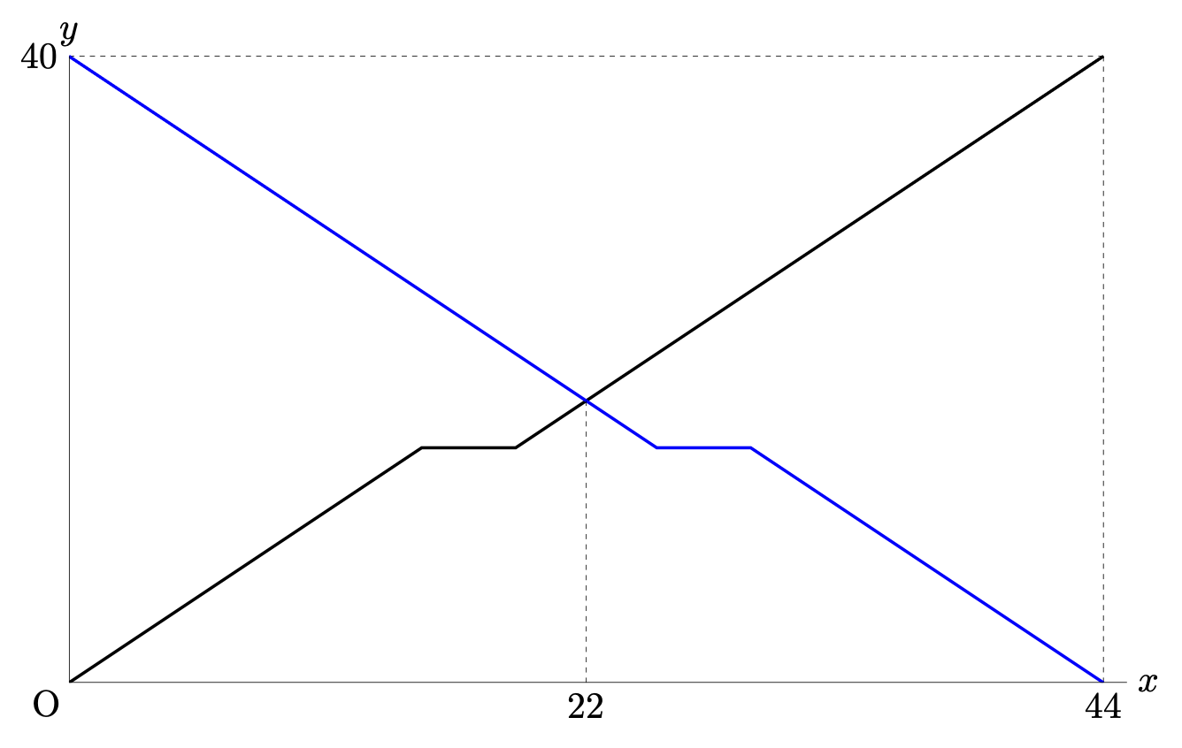 B駅の始発電車の動きを書き込むと図のような対称なグラフができあがります。したがって、2つの電車がすれ違うのはちょうど真ん中の時間なので6:22となります。このときB駅の始発列車は、B駅から22km進んでいることになるので、求める値は $40-22=18$ よりA駅から18kmの地点であることが分かります。
