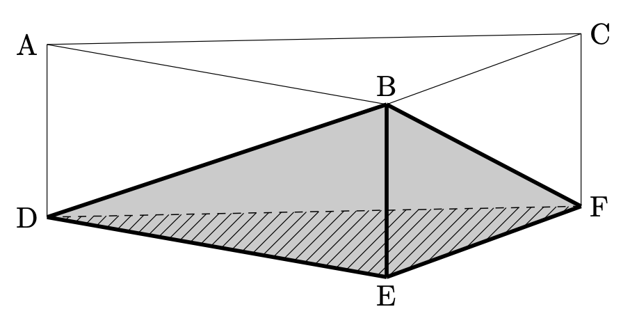 となります。そして、四角錐$\mathrm{B-ADFC}$は下図のように、三角柱$\mathrm{ABC-DEF}$から三角錐$\mathrm{B-DEF}$を引いたものとなります。