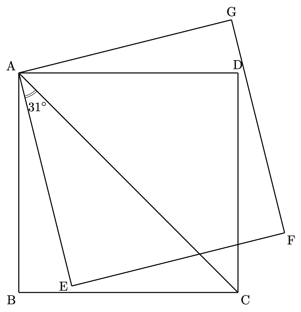 (1)は下図のように $\angle\mathrm{EAC}=31^\circ$ としたときの $\angle\mathrm{ADG}$ の大きさを求める問題です。
