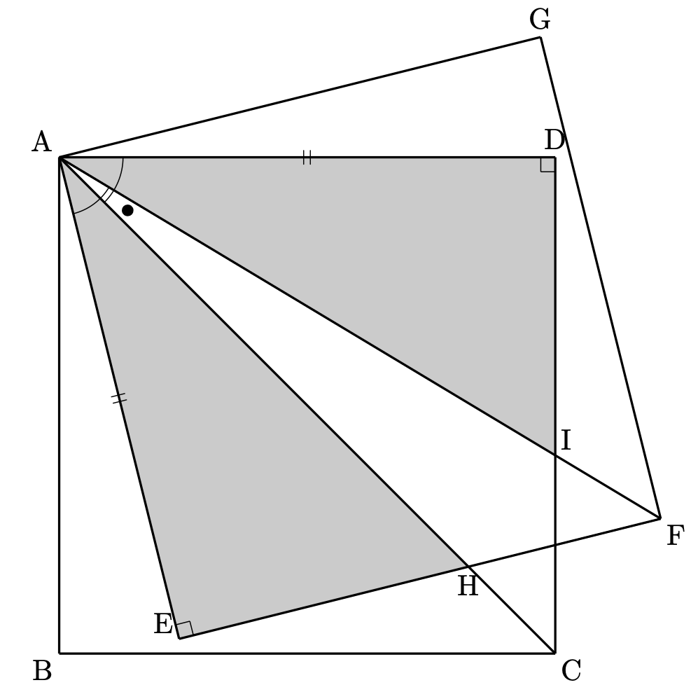 まずは合同な正方形の1辺であることから $\mathrm{AE=AD}$ が言えます。次に、正方形の内角の1つであることから $\angle\mathrm{AEH}=\angle\mathrm{ADI}=90^\circ$ となります。
