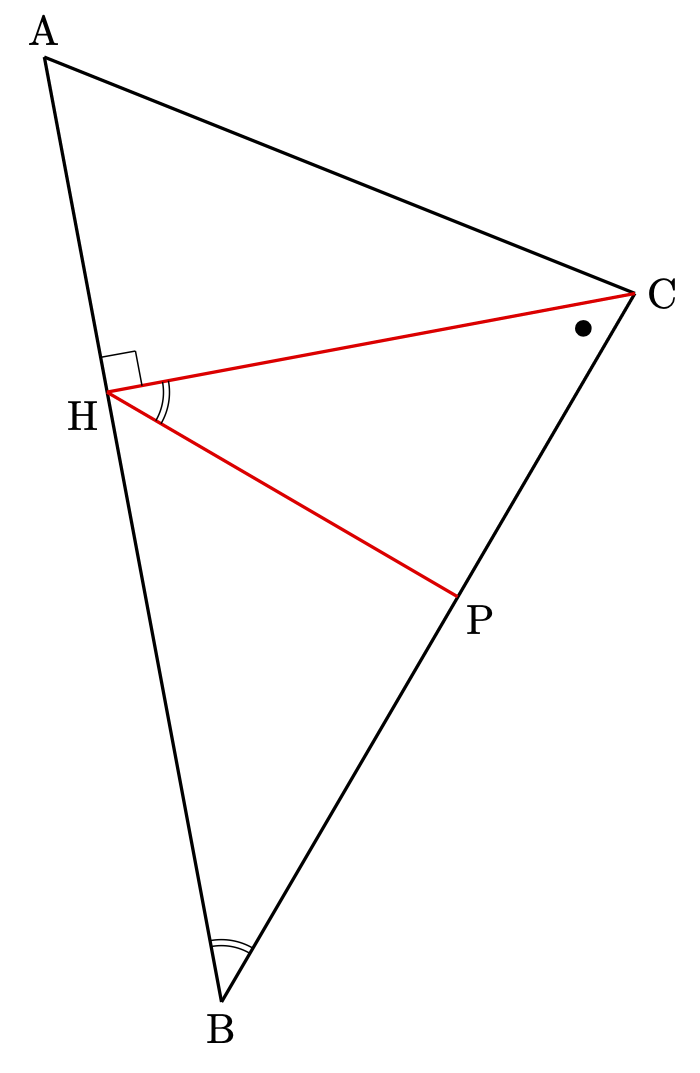 - 頂点Cから辺ABにひいた垂線と辺ABとの交点をHとしたとき、$\angle\mathrm{ABC}=\angle\mathrm{PHC}$ となる