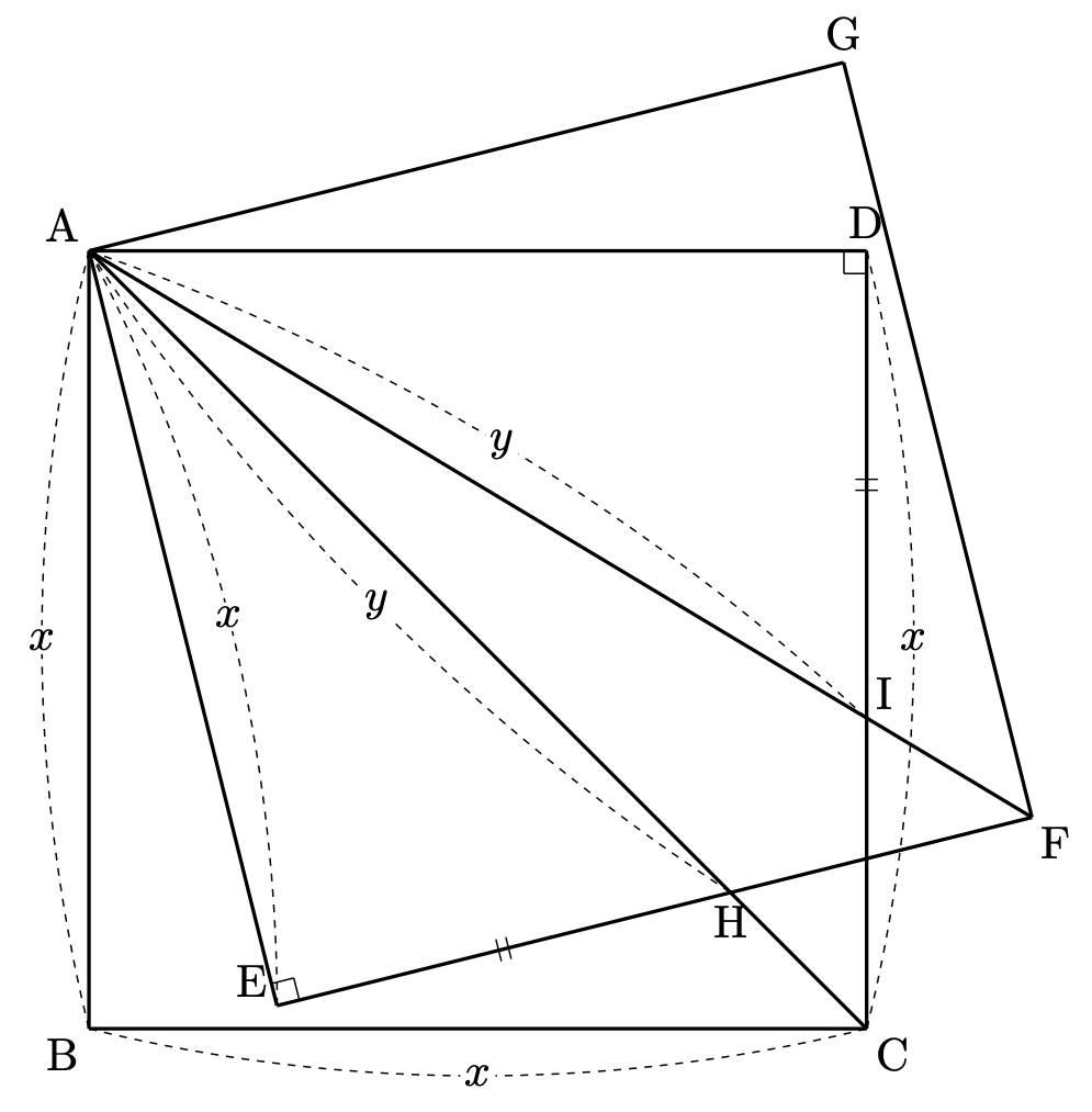 となります。また、同じく合同であることから、$\mathrm{AH=AI}$ となります。これを $y$ としておきましょう。
