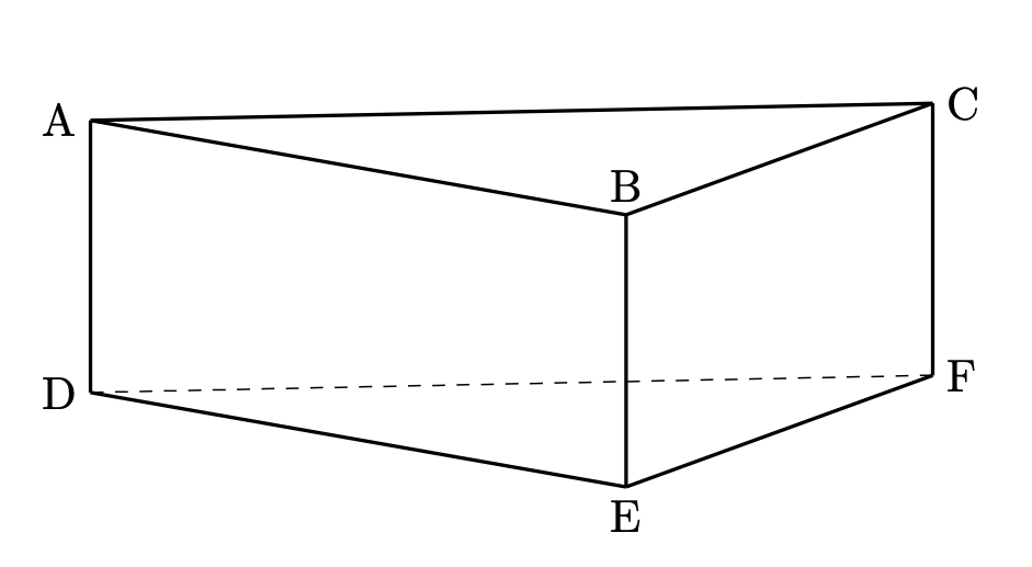 三角錐は三角柱の$\displaystyle\frac{1}{3}$の体積となり、残った四角錐$\mathrm{B-ADFC}$は三角柱の$\displaystyle\frac{2}{3}$となるので