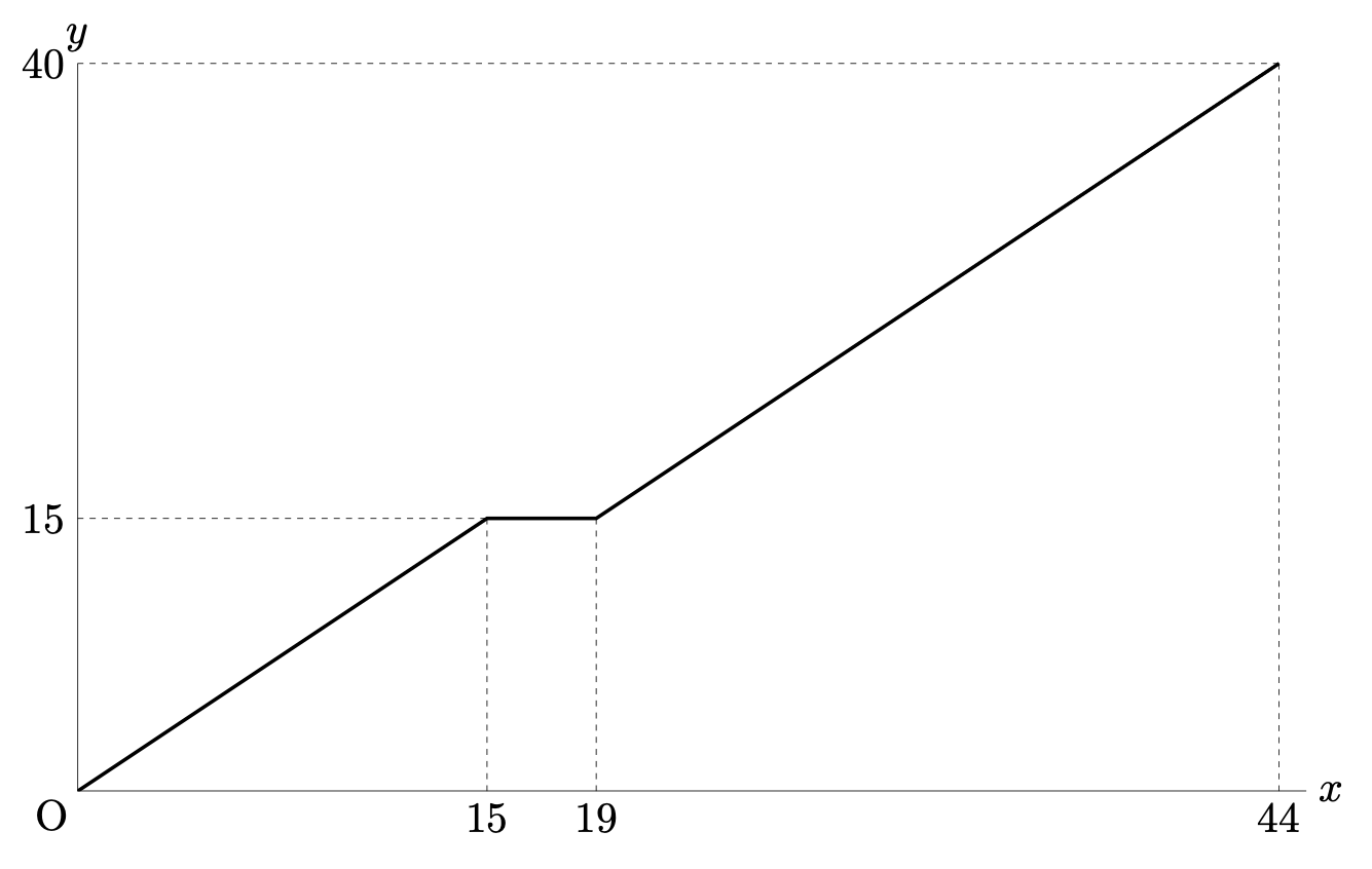 こんな感じのグラフが与えられています。A駅からB駅までの40kmを、途中P駅に4分停車して44分で運行する電車のグラフです。A駅、B駅とも始発は6時で、その後10分間隔で電車が発車します。