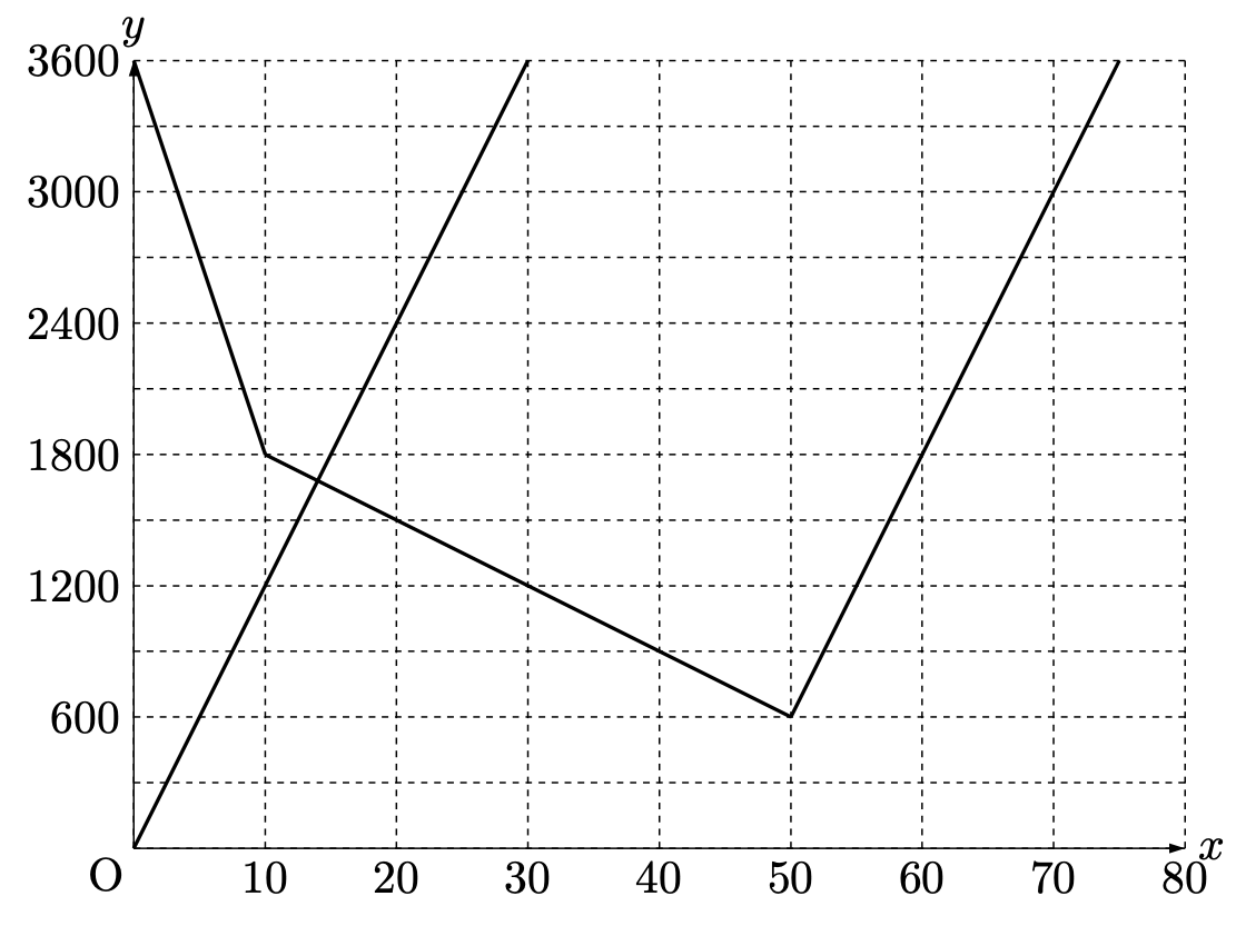 (3)は、Bさんが、AさんがP地点を出発するのと同時にQ地点を出発して、ボートに乗ってPまで進んだという設定です。ボートの速さはAさんもBさんも同じです。グラフにかくと以下のようになります。