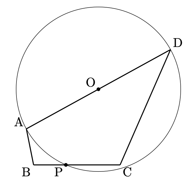 $\angle\mathrm{APD}=90^\circ$ からすぐに $\mathrm{AD}$ に対する円周角がイメージできればOKです。$\mathrm{AD}$ が円の直径となることも当然の事実として押さえておきたいところです。