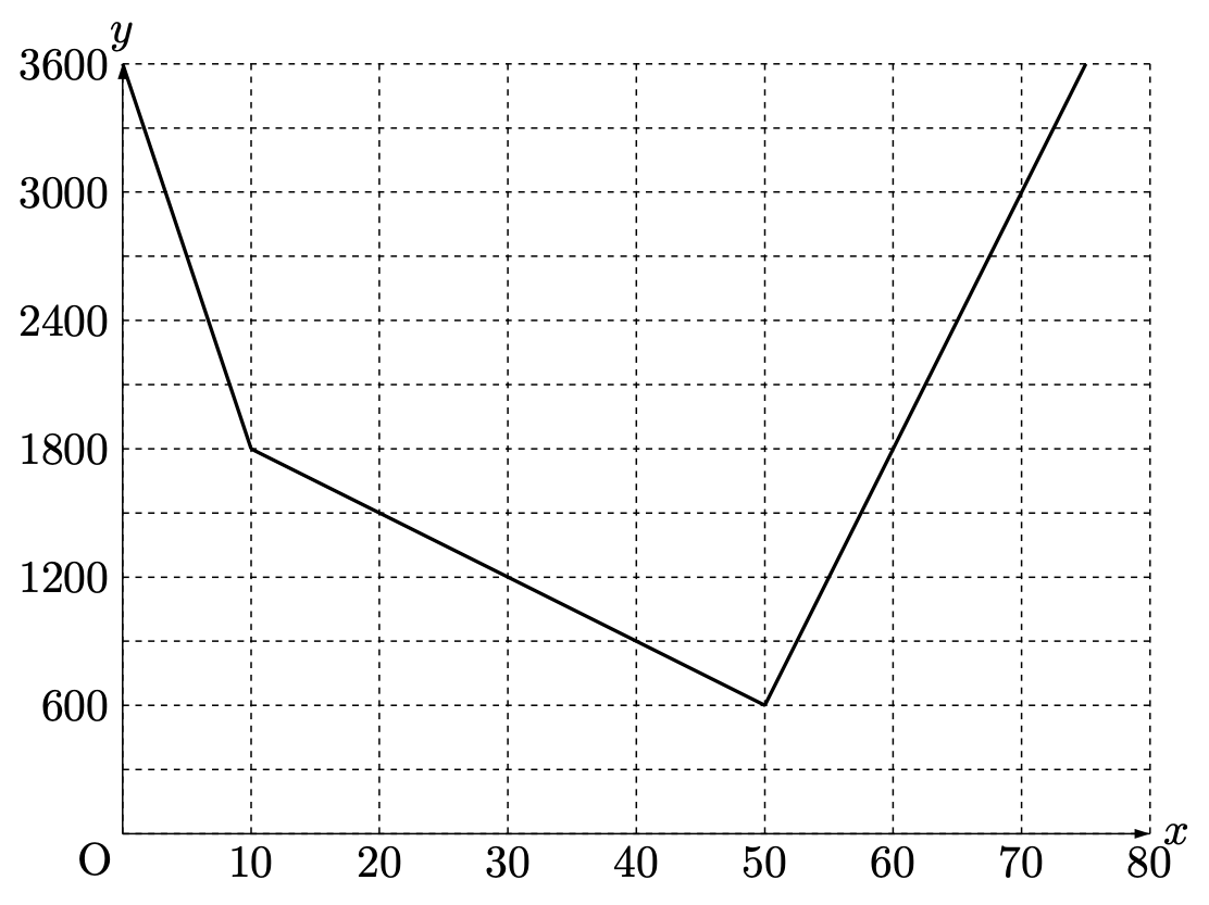 グラフから、図の点について A$(0,\ 2100)$、B$(30,\ 3600)$、C$(30,\ 1200)$ がすぐに分かるので、$\mathrm{AO:BC}=2100:2400$ となります。三角形の相似が見え、相似比は $7:8$ です。