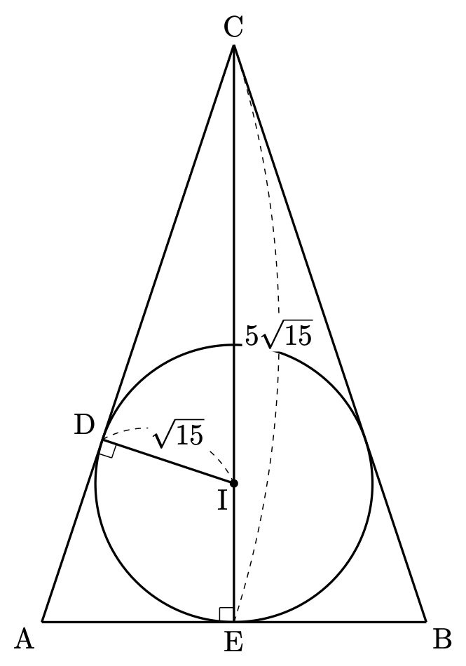 このとき、$\mathrm{CI}=4\sqrt{15}$ であり( $\mathrm{EI}$ も半径なので $\sqrt{15}$ です!)、$\triangle\mathrm{CDI}$ に三平方の定理を用いると