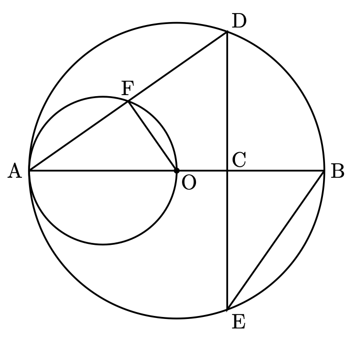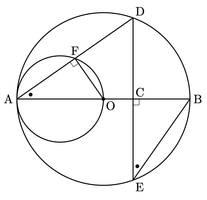 が言えます。また、小さい円についても直径に対する円周角を考えると $\angle\mathrm{AFO}=90^\circ$ が言えます。