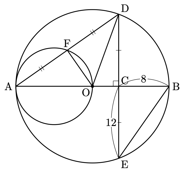 となります。さらに、弦 $\mathrm{DE}$ が点 $\mathrm{C}$ によって二等分されているので $\mathrm{CE}=12$ となります。