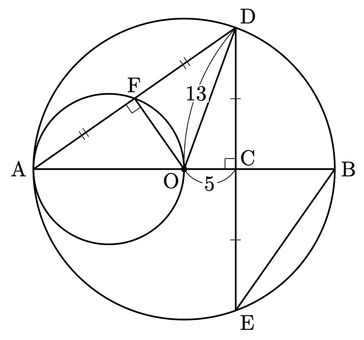 (2)の図にさらに、線分 $\mathrm{OD}$ を加えます。そして、$\mathrm{OC=5}$、円 $\mathrm{O}$ の半径が $13$ という条件が加わります。このとき、$\triangle\mathrm{ODF}$ の面積を求めよという問題でした。