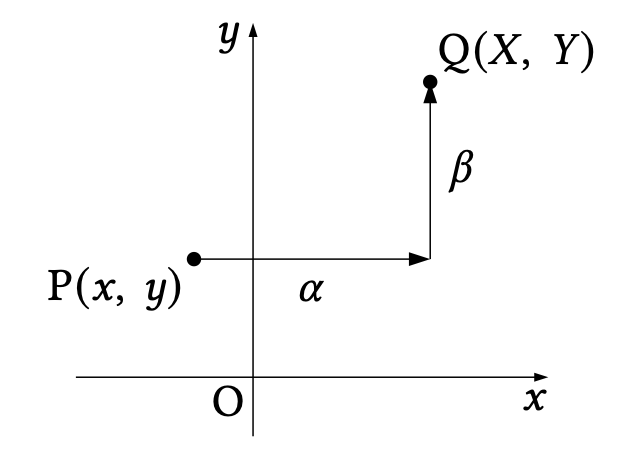 ここで、点 $\mathrm{P}$ を $x$軸方向に$\alpha$、$y$軸方向に$\beta$ 移動して点 $\mathrm{Q}$ をとります。あくまで点の移動だけ考えてください。