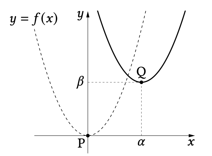 破線のグラフ $y=f(x)$ 上の点 $\mathrm{P}$ を $x$ 軸方向に $\alpha$、$y$ 軸方向に $\beta$ 移動した点を $\mathrm{Q}$ とします。