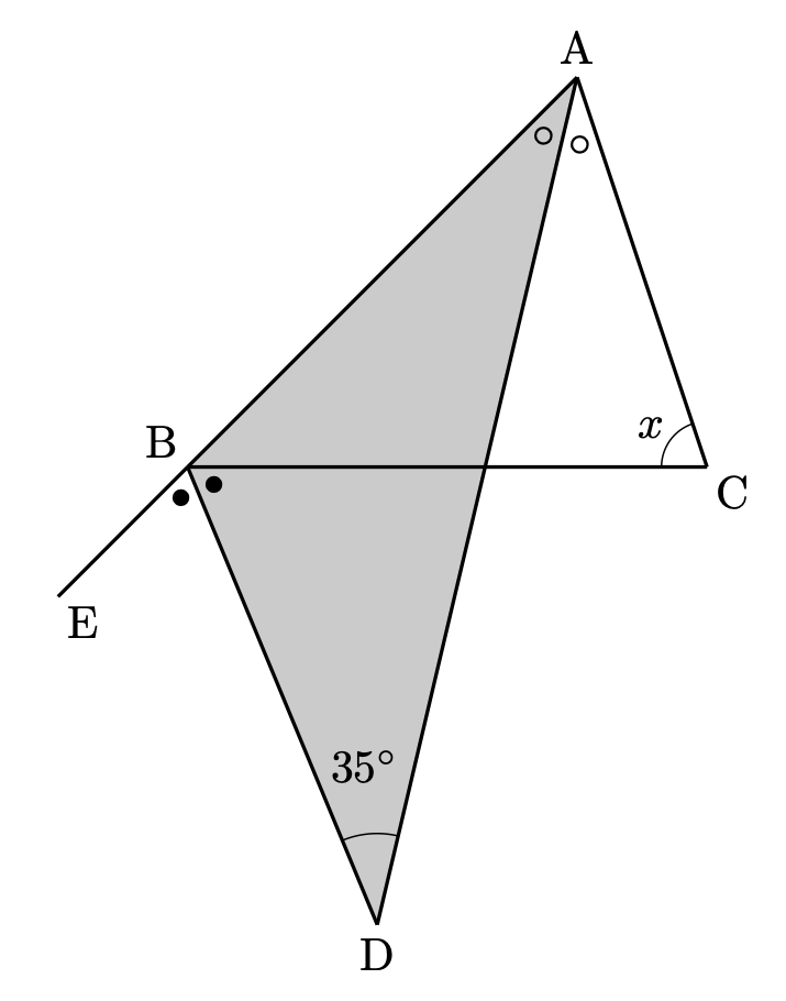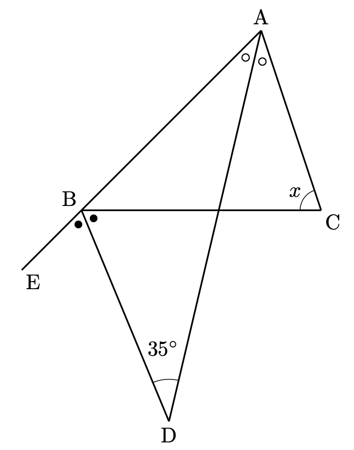 同様に三角形 $\mathrm{ABC}$ に着目すると、外角 $\angle\mathrm{EBC}$ について
