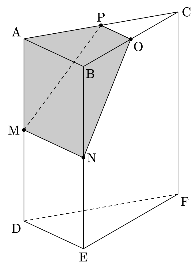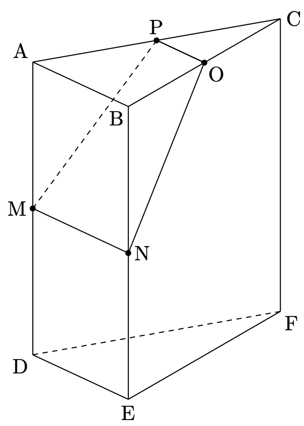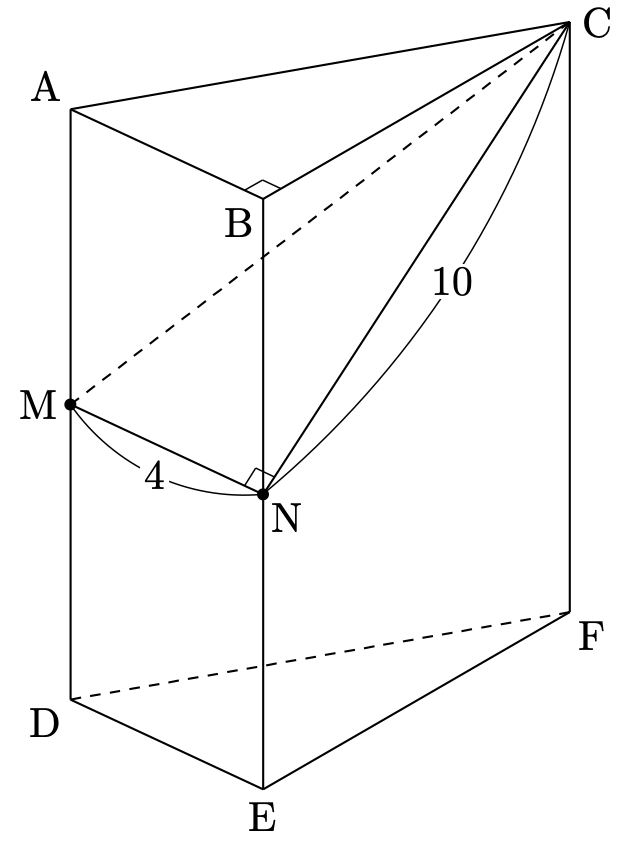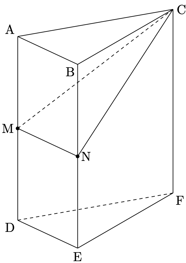図のような三角柱が与えられていました。$\mathrm{M}$、$\mathrm{N}$ は中点です。